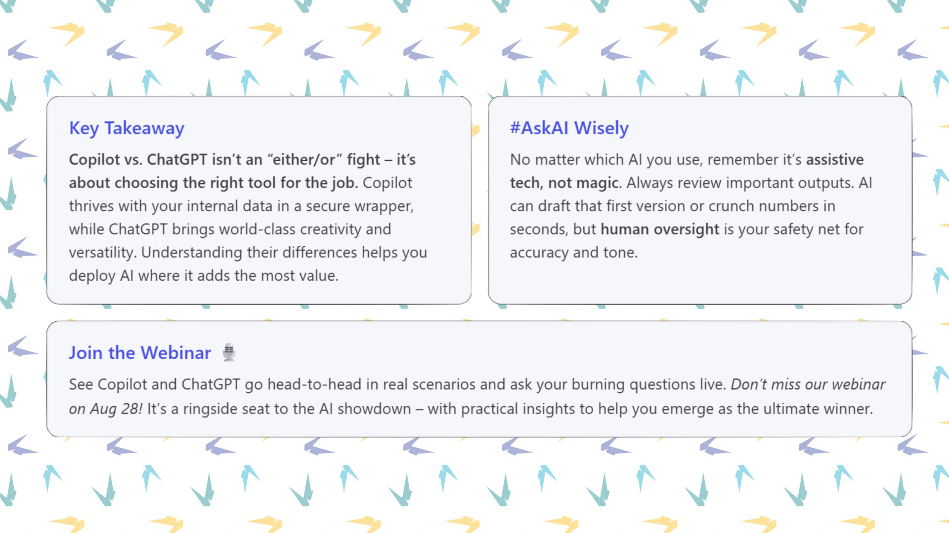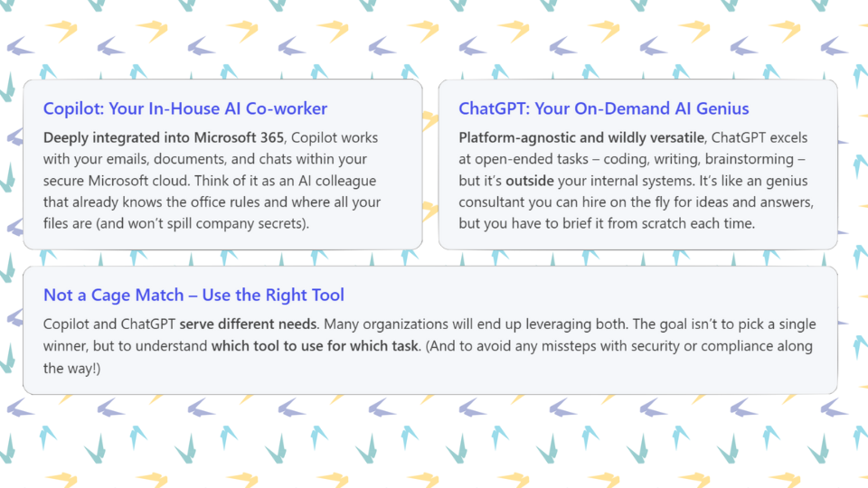 In many cases, the real winning strategy is using both: for example, roll out Copilot to handle internal content and task automation, while also enabling a vetted version of ChatGPT for innovation and ideas that go beyond the Microsoft sphere. They’re not mutually exclusive. In fact, they can complement each other. One manages your internal knowledge, the other connects you to the world’s knowledge.