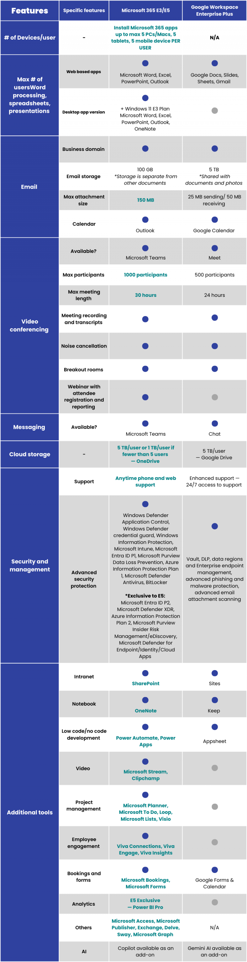 - Microsoft 365 E3/E5 vs. Google Workspace Enterprise Plus