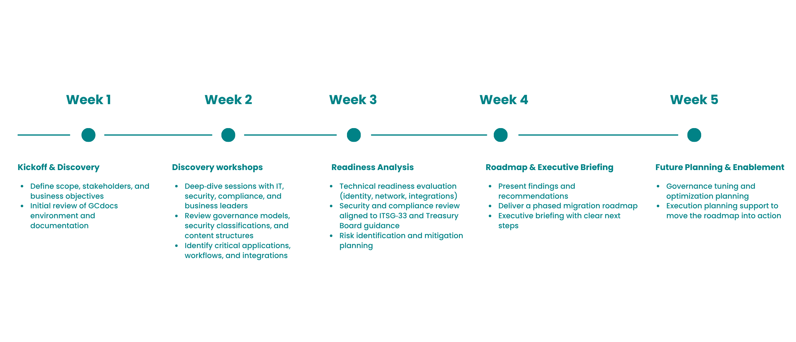 Our structured migration assessment eliminates guesswork. Every week has a defined purpose, defined outputs, and a clear handoff to the next phase.
